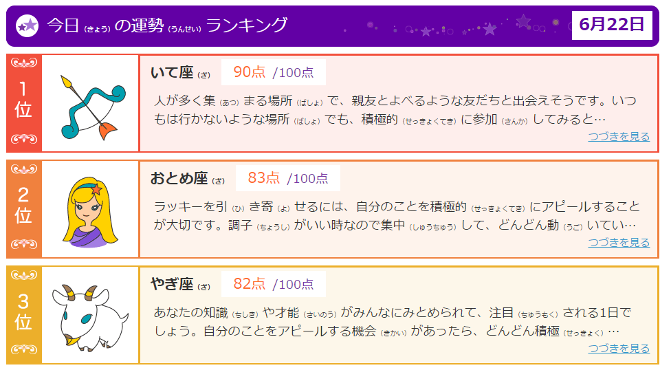 ได้ทั้งชะตาชีวิตแถมยังได้ความรู้อีกนะครับ สนใจอ่านได้ตามลิ้งค์นี้เลยครับ http://cvt.kids.yahoo.co.jp/yomigana/index.cgi?ykvrank0&ykvdesturl=http%3A%2F%2Frdsig.yahoo.co.jp%2Fkids%2Ftop%2Fserv%2Ffortune%2FRV%3D1%2FRU%3DaHR0cDovL2tpZHMueWFob28uY28uanAvZm9ydHVuZS8-