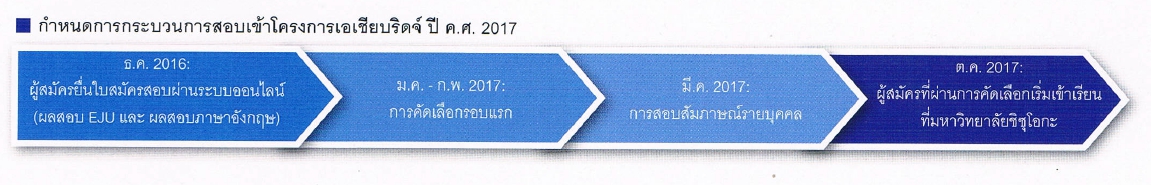 ธ.ค.2016 ผู้สมัครยื่นใบสมัครสอบผ่านระบบออนไลน์(ผลสอบ EJU และผลสอบภาษาอังกฤษ) → ม.ค.-ก.พ.2017 การคัดเลือกรอบแรก