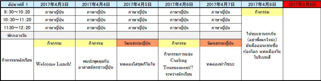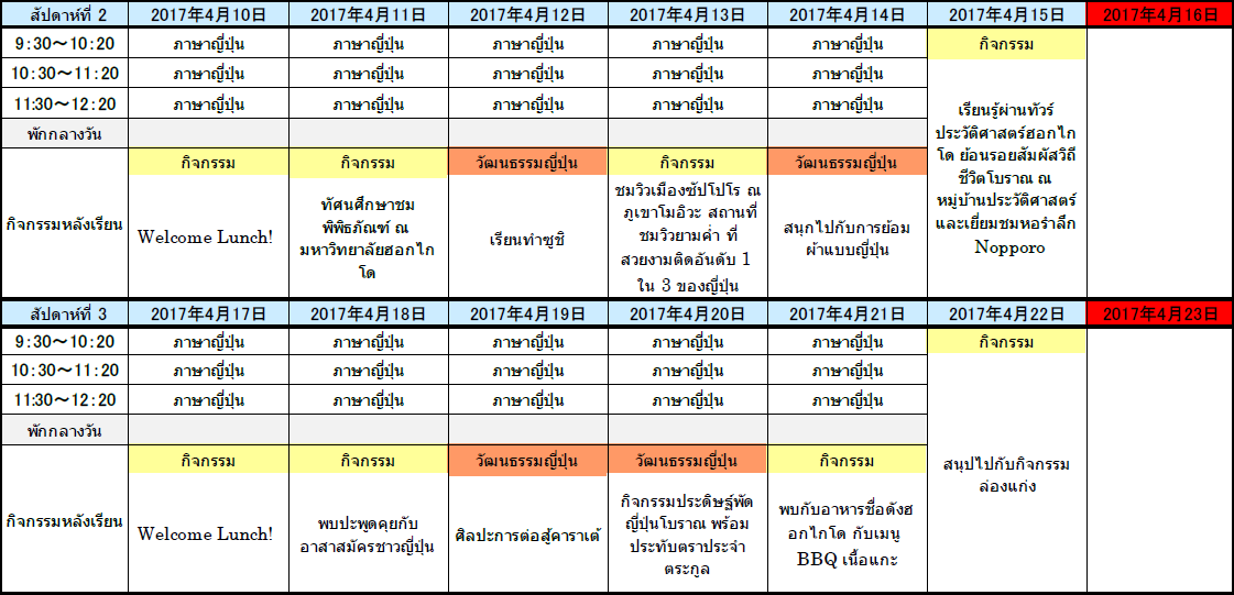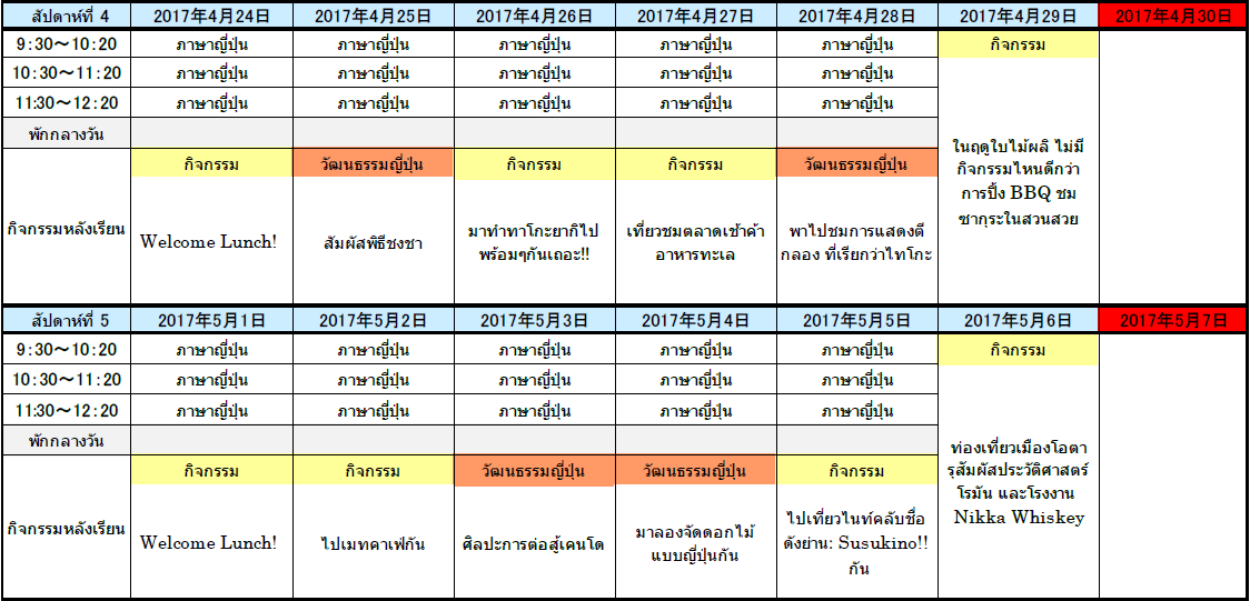 ด้านล่างนี้จะเป็นตารางเรียนและกิจกรรมทั้งหมดของคอร์สฤดูใบไม้ผลิครับ